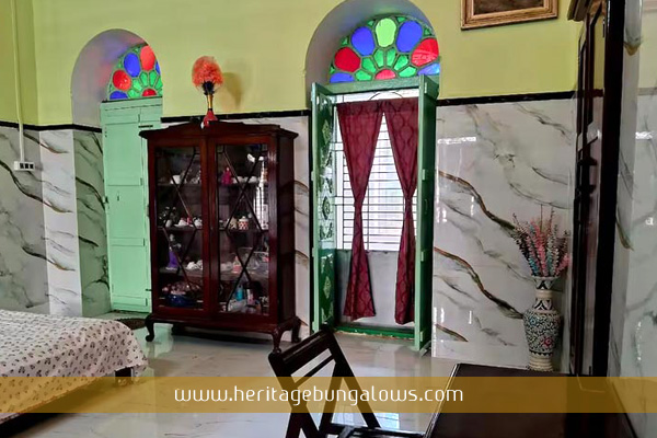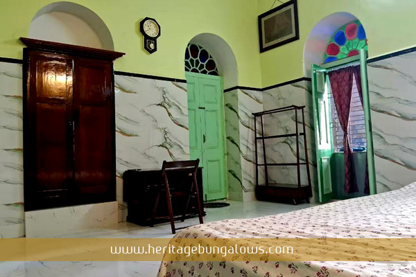 Presently, two rooms have been renovated within this heritage Zamindar House where guests are put up. Both rooms have been decked with period furniture and exude the charm of staying in a typical Bengali Zamindar house with their Khirki windows, Kari- Barga ceilings and Belgium Glass-cut Window panes. A spacious rooftop has been opened for the guests, where they can laze around in the evenings under the open sky and share stories of the past from the hosts.